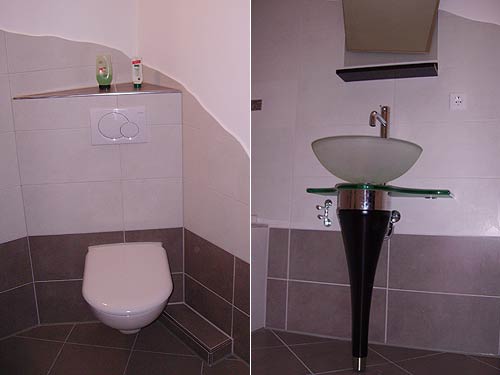 10 Jahre altes Bad wurde neu aufgepeppt. Trockner und Waschmaschine finden im Schrank neben der Badewanne Platz. Duschmöglichkeit in einer Standardbadewanne mit Kopfbrause und Echtglas-Spritzschutz. Designerwaschbecken der besonderen Art. WC Spülkasten wurde neu angeordnet.