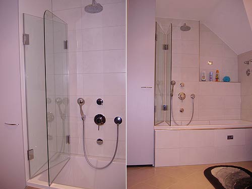 10 Jahre altes Bad wurde neu aufgepeppt. Trockner und Waschmaschine finden im Schrank neben der Badewanne Platz. Duschmöglichkeit in einer Standardbadewanne mit Kopfbrause und Echtglas-Spritzschutz. Designerwaschbecken der besonderen Art. WC Spülkasten wurde neu angeordnet.