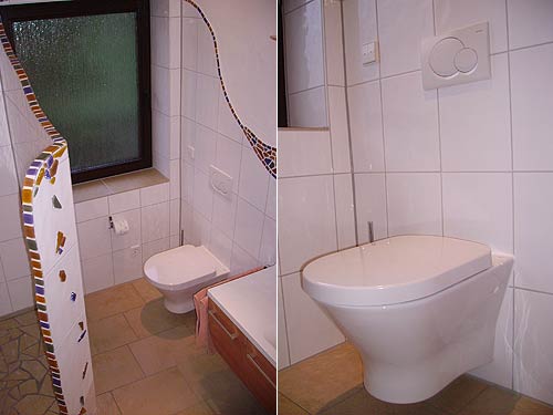 Begehbare Dusche mit Fußbodentemperierung, Wand-WC, Waschtisch-Schrank Kombination.