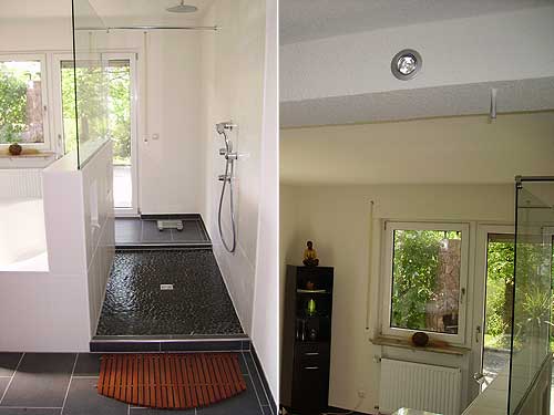 Komplett neue Versorgungsleitungen, Heizkörpererneuerung, Fußbodenheizung im gesamten Bad, begehbare Dusche, große Badewanne für zwei Personen, im Bad liegendes separates WC, Saunaraum.